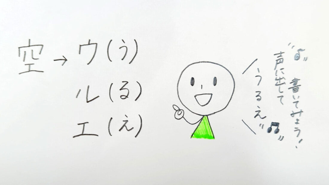 これは、漢字のパーツひとつずつに名前を付けて、歌や声に出して覚える方法です。 例えば、「空」と言う漢字。これを、細かに分解してみます。「ウ」/う/、「ル」/る/「エ」/え/となります。これを口に出しながら、もしくは歌に乗せて言ってみます♪このように、漢字覚え替え歌のようにして、「耳から聞いて覚える方法」で覚えていく子もいます。(イラスト)