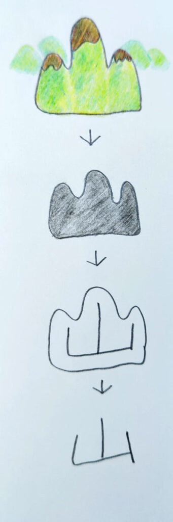漢字には意味がある、と言うふうに最初は習います。「山」と言う漢字はイラストのような成り立ちですね。この絵から徐々に崩れて最終的に「山」となります。 こういうふうに、イラストや絵を見せ、漢字の成り立ちを見ながら書くと覚えやすい子もいます。